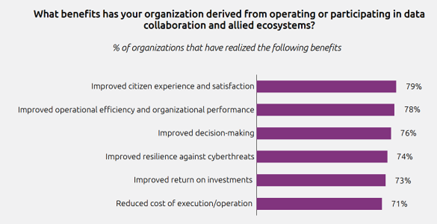 Uit het rapport blijkt dat gezamenlijke data-ecosystemen overheidsorganisaties helpen op belangrijke functionele gebieden zoals administratie, veiligheid en defensie, belastingen, douane en welzijn. Zo zegt bijvoorbeeld 81% van de lokale, nationale en centrale overheden die data-ecosystemen hebben ingevoerd of nog invoeren dat zij de betrokkenheid van burgers hebben verbeterd en duurzaamheidsinitiatieven op de rails hebben gezet. 93% van de respondenten wijst op een toename van de openbaarheid van bestuur. Bovendien kunnen burgers profiteren van betere overheidsdiensten, zoals een meer gerichte verstrekking van sociale programma’s voor de meest kwetsbare burgers en een verbeterde openbare veiligheid. Hierbij maken politiediensten melding van een betere juridische uitvoering en snellere reactietijden. 74% van de organisaties in de publieke sector die data-ecosystemen hebben ingezet of nog steeds inzetten, zien ook een verhoogde weerbaarheid tegen cyberdreigingen.