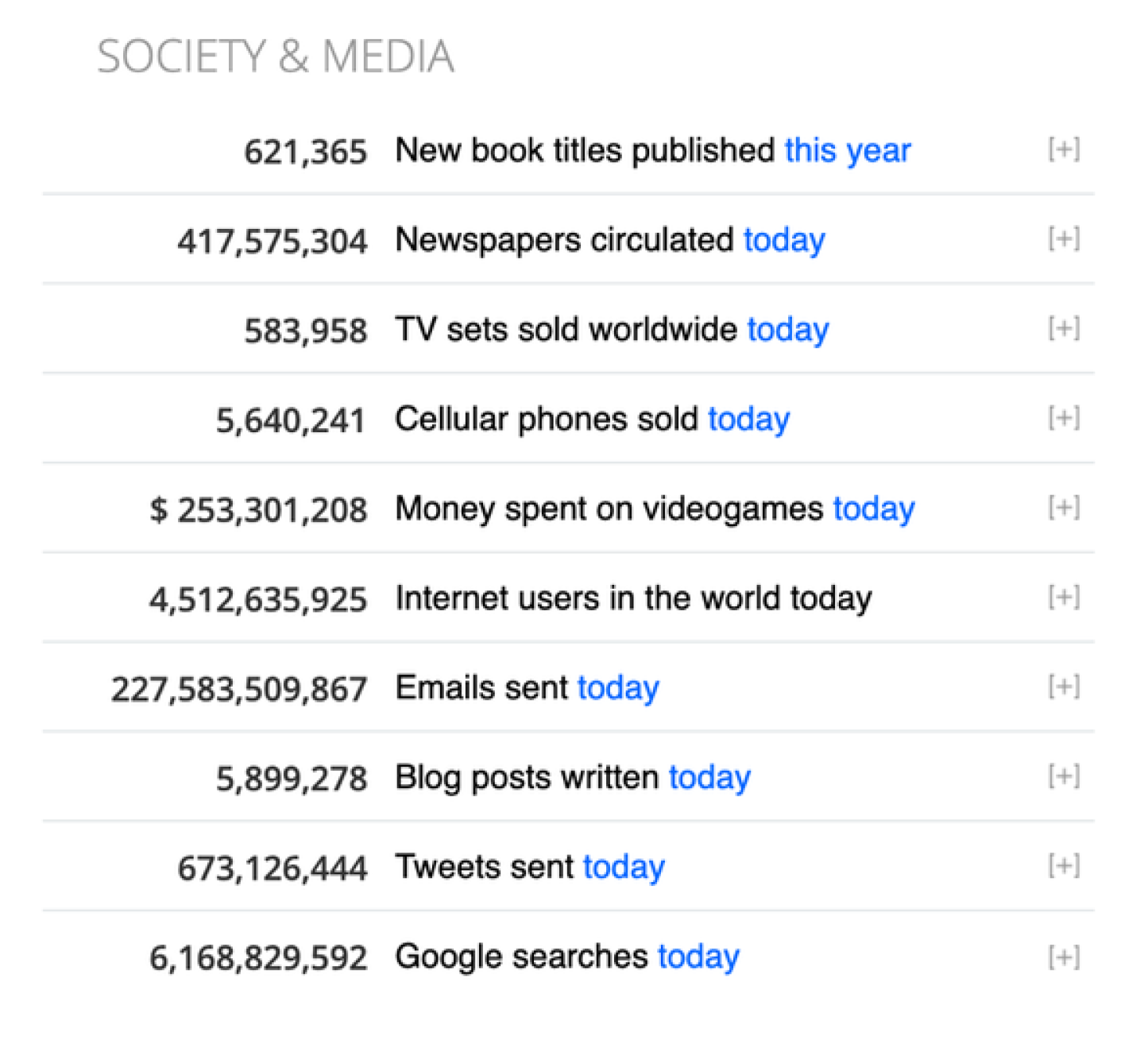 Daarover gesproken: je wordt ook moe van het afstruinen van het web op zoek naar de laatste coronastatistieken. Van het zoeken en de cijfers. Dat laatste kan ik helaas niet verbeteren voor je, maar het zoeken naar goede data wel. Op de site van Worldometers vind je live-statistieken van corona-ontwikkelingen, naast – en daar kende ik de site al van – allerhande interessante gegevens wereldwijd. Bijvoorbeeld hoeveel fietsen er op dit moment worden geproduceerd. En dat er de afgelopen 24 uur 228 miljard mails (!) zijn verstuurd. Daarentegen nog maar 5,9 miljoen blogs. Dus daar kan deze nog wel bij.