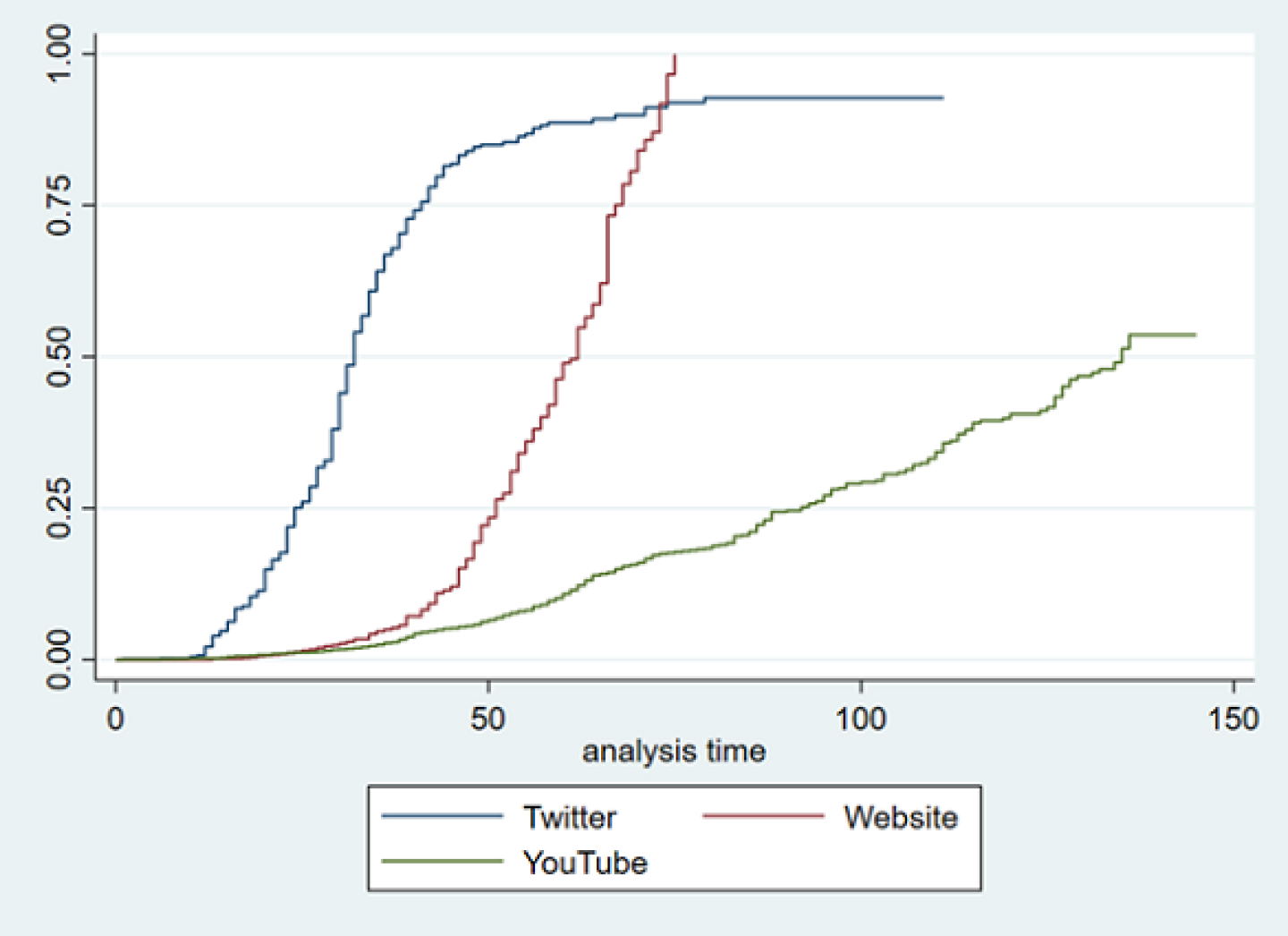 Onderstaande figuur toont de resultaten van de zogeheten Kaplan-Meierschattingen voor de gemeentelijke ingebruikname van websites, Twitter en YouTube door gemeenten (maanden). De X-as toont de ‘overlevingsduur’ voor het betreffende interval (in maanden). We zien de cumulatieve kans op ingebruikname op de Y-as.
