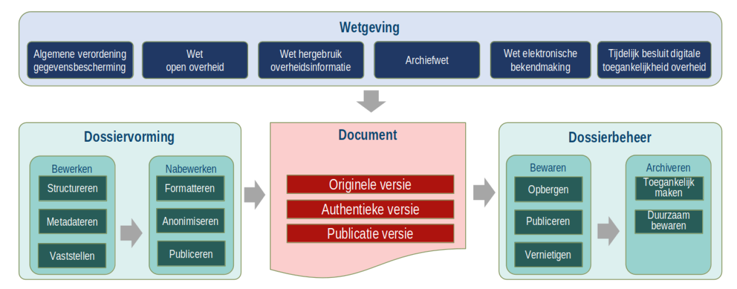 Daarnaast worden vanuit verschillende sectorwetten, zoals de Omgevingswet, allerlei eisen gesteld aan documenten. De consequentie is dat de overheid relevante documenten niet alleen dient te bewaren in een ‘goede, geordende en toegankelijk staat’, maar ook maatregelen moet treffen voor openbaarheid, herbruikbaarheid en vindbaarheid van informatie.