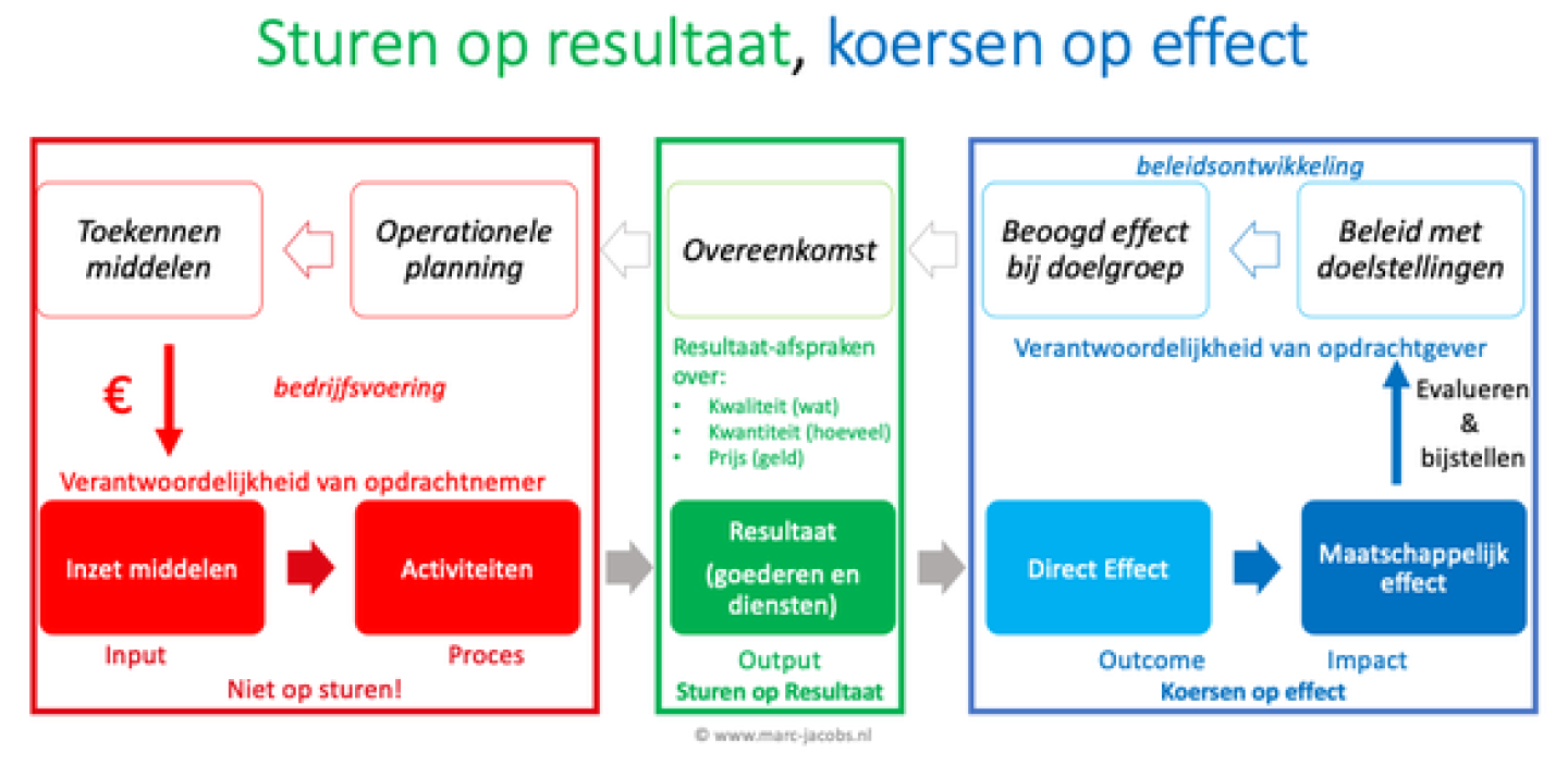 De opdrachtnemer doet vervolgens een voorstel waarbij deze omschrijft wat er geleverd kan worden tegen welke prijs met welk (beoogd) effect. Samen maken de opdrachtgever en opdrachtnemer afspraken over de te leveren resultaten, de overeenkomst (het groene vlak). De opdrachtnemer is vervolgens verantwoordelijk voor de realisatie van de producten. De realisatie en de bedrijfsvoering zijn het domein van de opdrachtnemer (het rode vlak). Op die resultaten wordt door de opdrachtgever gestuurd en afgerekend. Dat is sturen op resultaat.