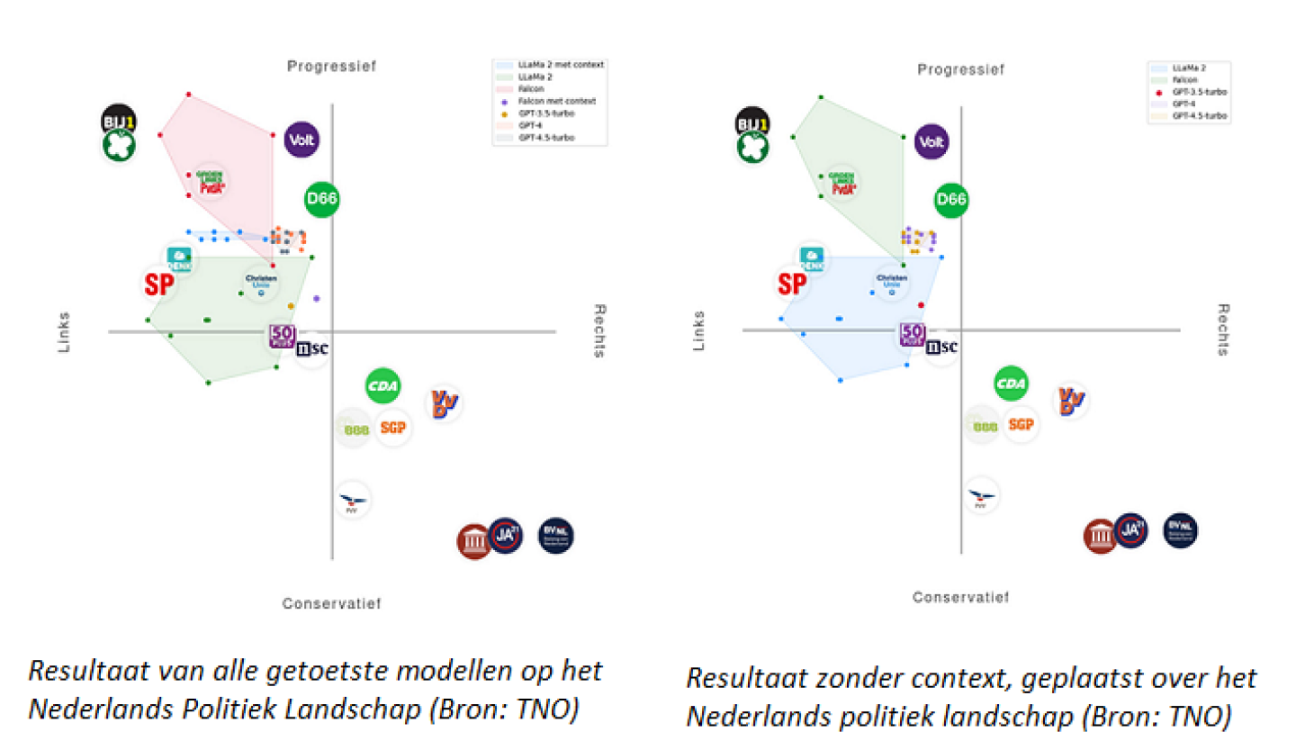 Uit bovenstaande resultaten concludeert TNO dat de taalmodellen heel wisselvallig zijn, te zien aan de ingekleurde oppervlakte, en ook dat de modellen met name links georiënteerd.