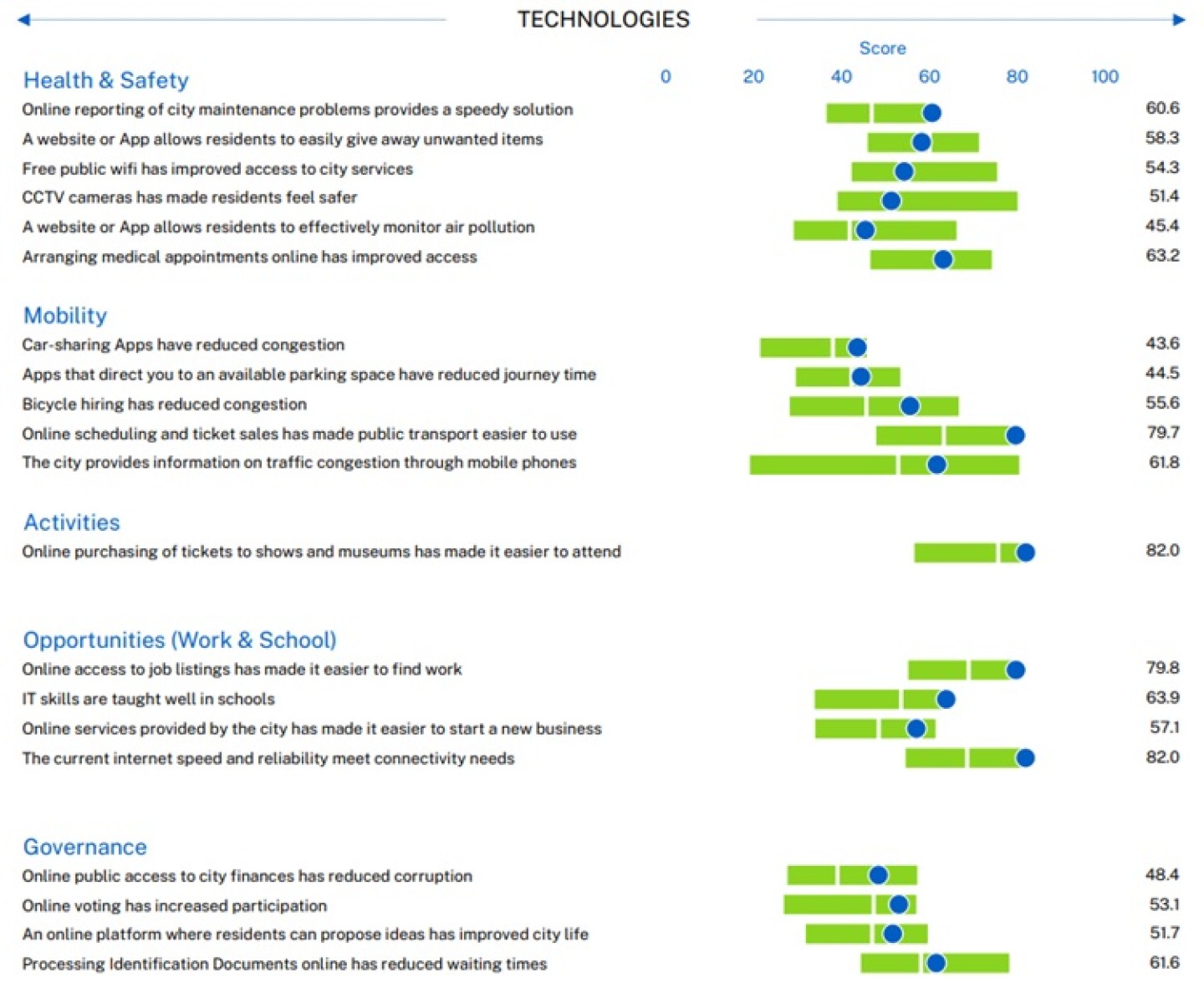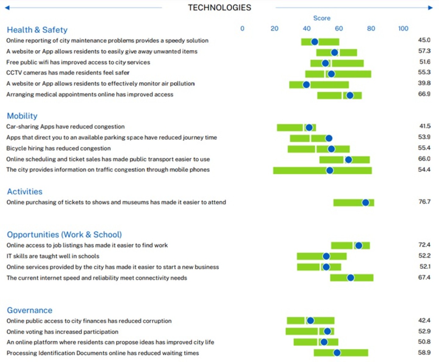 Amsterdam scoort vooral punten met het culturele aanbod (en de mogelijkheid daar digitaal kaartjes voor te kopen), de snelheid van het internet en de staat van de medische zorg. Ondergemiddeld doet de stad het op het gebied van beschikbaarheid van betaalbare huizen, de luchtkwaliteit en de doorstroming van het verkeer.