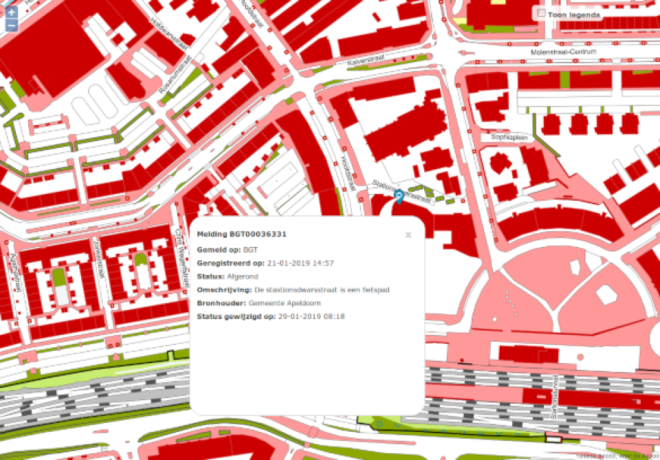 De afgelopen jaren is er door de verschillende bronhouders, waaronder gemeenten, provincies en waterschappen, hard gewerkt aan de totstandkoming van de BGT. “Dat was de eerste fase. Tot 2020 zit de BGT in een tweede transitiefase, een fase waarin alle overheden ervoor moeten zorgen dat de informatie die zij hebben aangeleverd, gecontroleerd en juist is. In een aantal gevallen is dat best nog een uitdaging. Je ziet, nu de kaart ook echt wordt gebruikt, dat er vanuit verschillende kanten suggesties en wensen komen om de kaart nog beter te maken.” Een van de manieren waarop gebruikers die wensen en suggesties kunnen aangeven, is via Verbeter de Kaart, het officiële systeem voor ‘terugmelden’ op verschillende basisregistraties, waaronder de BGT en de Basisregistratie Topografie (BRT): “Verbeter de Kaart is een laagdrempelige voorziening voor mensen die de kaartinformatie willen helpen verbeteren of feedback willen geven. Iedere melding die met behulp van Verbeter de Kaart wordt gedaan, komt automatisch terecht op het bureau van degene die dat stuk van de BGT bijhoudt. Dat kan gaan om een fout, maar het kan ook gaan om een suggestie om de kaart nog beter te maken.”