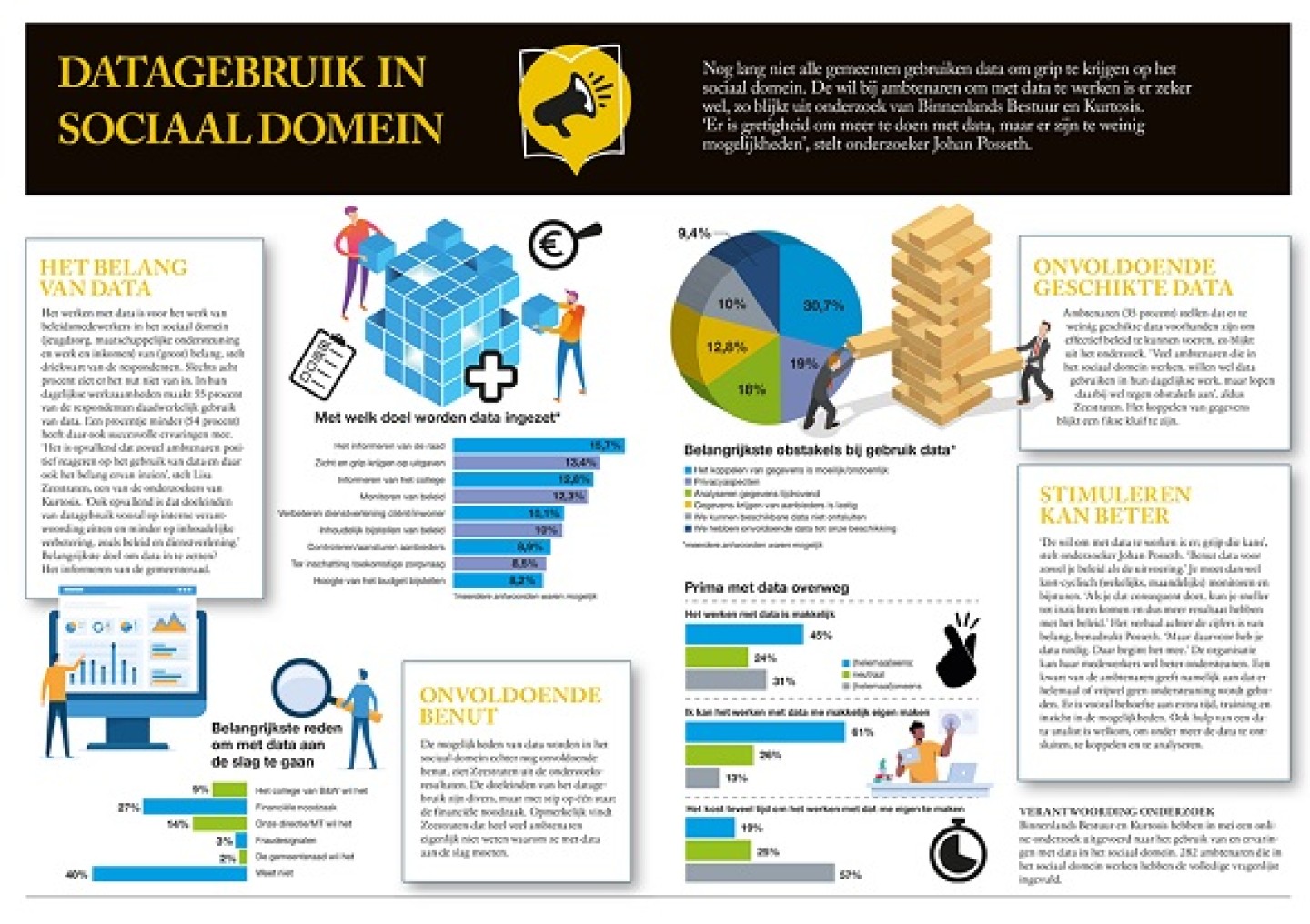 De mogelijkheden van data worden in het sociaal domein echter nog onvoldoende benut, stellen ambtenaren. 42 procent vindt dat hun gemeente mogelijkheden laat liggen. ‘Tot nu toe lukt het niet om ‘men’ ervan te overtuigen dat we bepaalde data nodig hebben. Zo registreren sociale wijkteams de inzet van jeugdhulp op school niet als zodanig. Terwijl die gegevens ontzettend waardevol zijn’, aldus een van de respondenten. Slechts zestien procent stelt dat hun gemeenten voldoende data-kansen pakt. De overige 42 procent staat er neutraal in.