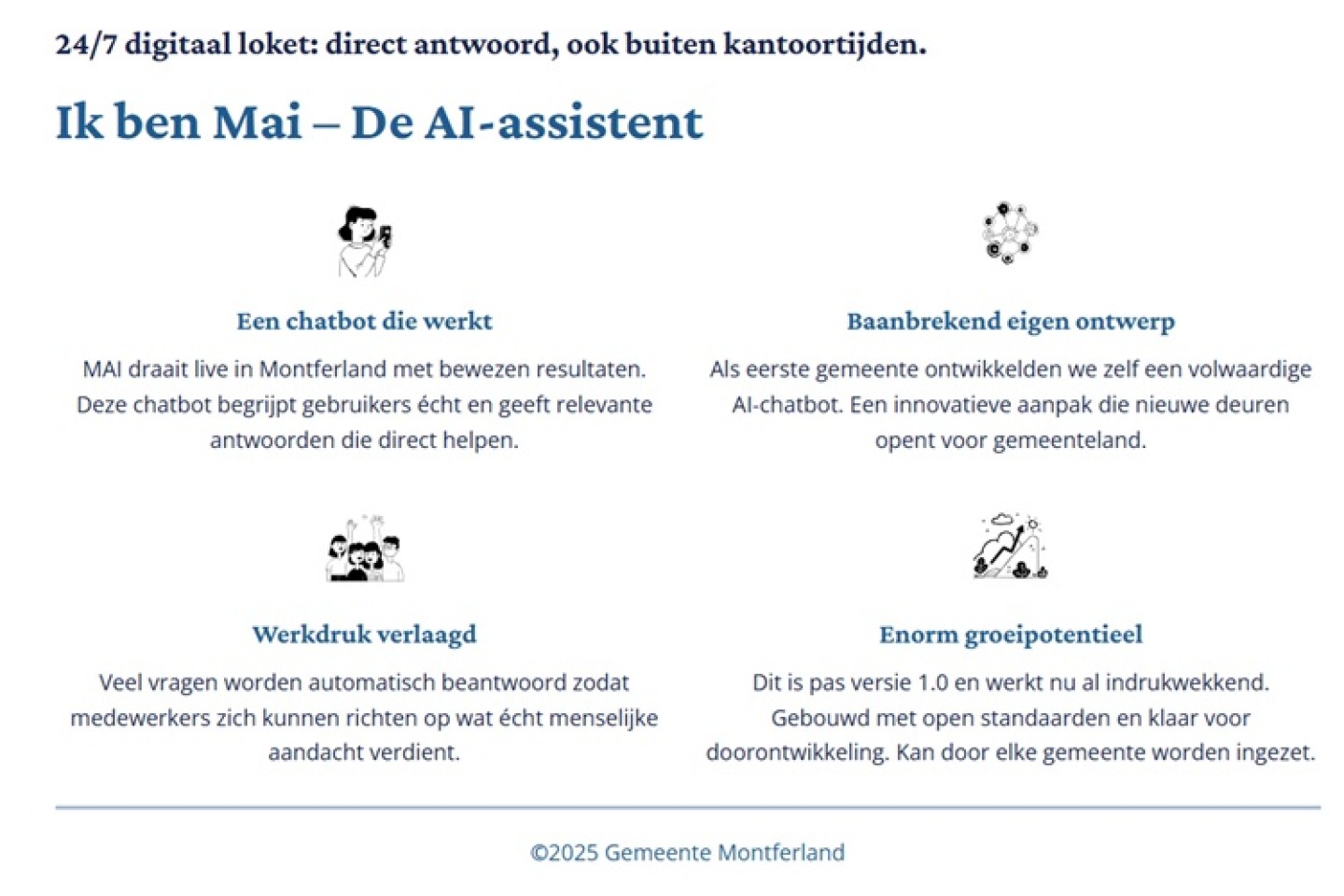 Een prachtig voorbeeld vind ik de gemeente Montferland, met hun pilot van de ‘Mai chatbot’. Ze gingen alle zeven perspectieven langs. Van goede technische keuzes tot grondige security-audits. Van datakwaliteit tot betrokkenheid van gebruikers. En wat bleek? Binnen een maand beantwoordde Mai 4.500 vragen met een oplossingsgraad van 95%.