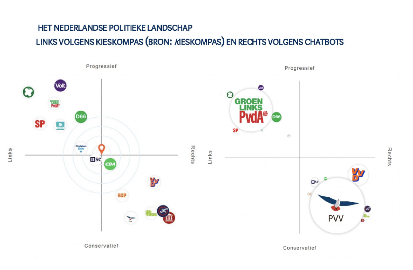 Het Nederlandse politieke landschap volgens Kieskompas (links) en chatbots (rechts) | Beeld: Autoriteit Persoonsgegevens