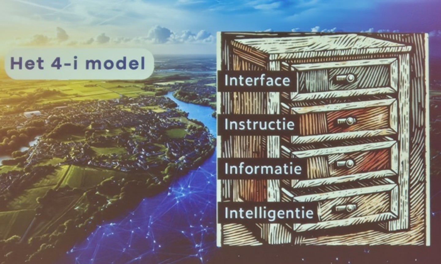 Ze zijn nu bezig met de productie omgeving, met gebruik van Open AI. "Europese modellen lopen helaas tien tot twaalf maanden achter." Hoornstra toont een plaatje van het 4-i model (de ladenkast methode). De basislaag is het taalmodel (intelligentie), maar dat heeft concrete informatie en een duidelijke instructie nodig om tot leven te komen.
