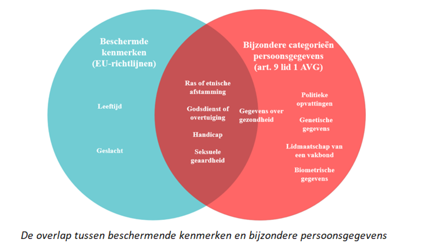 De AVG verbiedt in veel gevallen de verwerking van bijzondere persoonsgegevens, ook als het gaat om het tegengaan van discriminerende effecten van AI-systemen. Artikel 9 lid 1 AVG bevat een verbod (met uitzonderingen) op het gebruik van bepaalde soorten extra gevoelige gegevens, de zogenaamde ‘bijzondere categorieën van persoonsgegevens’. Deze categorieën overlappen grotendeels met de beschermde kenmerken uit de non-discriminatierichtlijnen van de Europese Unie. Overigens verbiedt de Nederlandse Algemene Wet Gelijke Behandeling ook discriminatie op grond van ‘politieke gezindheid’.