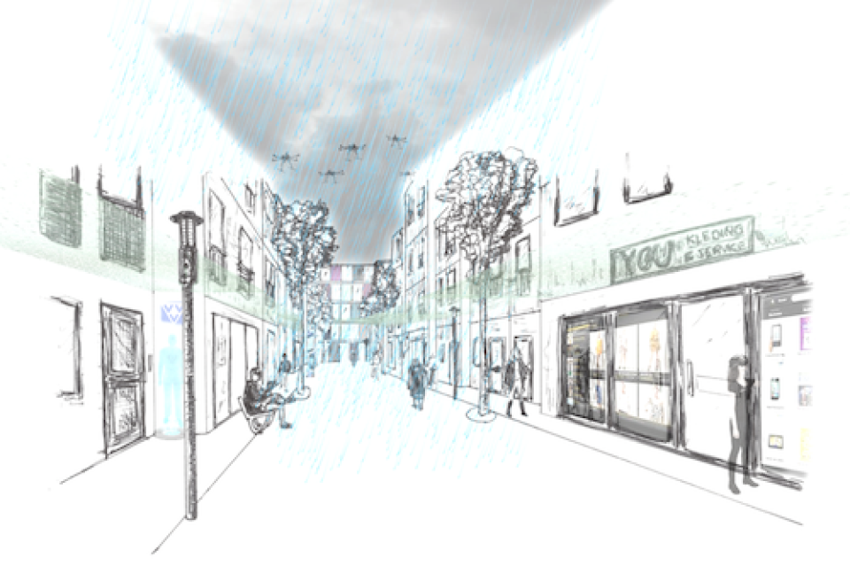 Beeld: Pixabay / juliaorige Het is een donderdagochtend 18 juli 2030, 11:00. Het belooft een hete zomerdag te worden. Het is druk in de binnenstad van Amsterdam. Veel mensen hebben vakantie, een perfect moment om gebruik te maken van de uitstekende service in de winkels die nog bestaan. 130 kilometer ten zuiden van Amsterdam, boven Antwerpen, ontwikkelt zich een onweersbui. De sensoren in Antwerpen registreren deze onweersbui in de database. Door het combineren van de verschillende weersvariabelen, zoals windrichting, windsnelheid, vochtigheid en massa, wordt berekend dat deze bui binnen twee uur Amsterdam zal bereiken. De gemeente Amsterdam wil het voor het verblijvend publiek in de binnenstad zo aangenaam mogelijk maken. Zij hebben daarom door een bedrijf een algoritme laten ontwikkelen, zodat iedereen een waarschuwing krijgt wanneer er een bui aankomt. Op deze manier regent niemand meer nat. Het algoritme suggereert voor iedereen een geschikte droge verblijfsplek. Hierbij wordt rekening gehouden met de huidige locatie van de persoon, persoonsinformatie en het tijdsstip. Door deze variabelen te combineren, ontstaat er voor iedereen een geschikte verblijfsplek voor dat specifieke moment. Iedereen krijgt een signaal over een geschikte verblijfsplek via een smart device. Verder zullen de algoritmes binnen de retailbranche inspelen op de komende regenval. Plotseling worden in de digitale etalages paraplu’s aangeboden. Wanneer mensen in deze winkel binnenkomen, zal duidelijk worden welke paraplu voor hen het meest geschikt is. Om de heftige regenval van de toekomst te kunnen verwerken is er meer waterberging nodig. Dit kan bijvoorbeeld door middel van groene daken. Wanneer er een heftige regenbui op komst is, zullen de zonnepanelen op de daken kantelen. Aan de onderkant van deze zonnepanelen is een sedum dakbedekking bevestigd. Deze dakbedekking zal ervoor zorgen dat er een goede afvoer van het water plaatsvindt. Daarnaast zal er een glazen overkapping uit de gevel komen, dit zorgt ervoor dat mensen droog kunnen blijven lopen. Nadat de heftige onweersbui over is getrokken, gaat iedereen de straat weer op. Om de ruimte op de straat zo snel mogelijk gebruiksvriendelijk te maken na de onweersbui, worden de bankjes verwarmd zodra het droog wordt. De bankjes ontvangen een signaal van sensoren door de hele stad. Deze sensoren hebben geregistreerd dat het weer droog is. Op dat moment worden de bankjes verwarmd.
