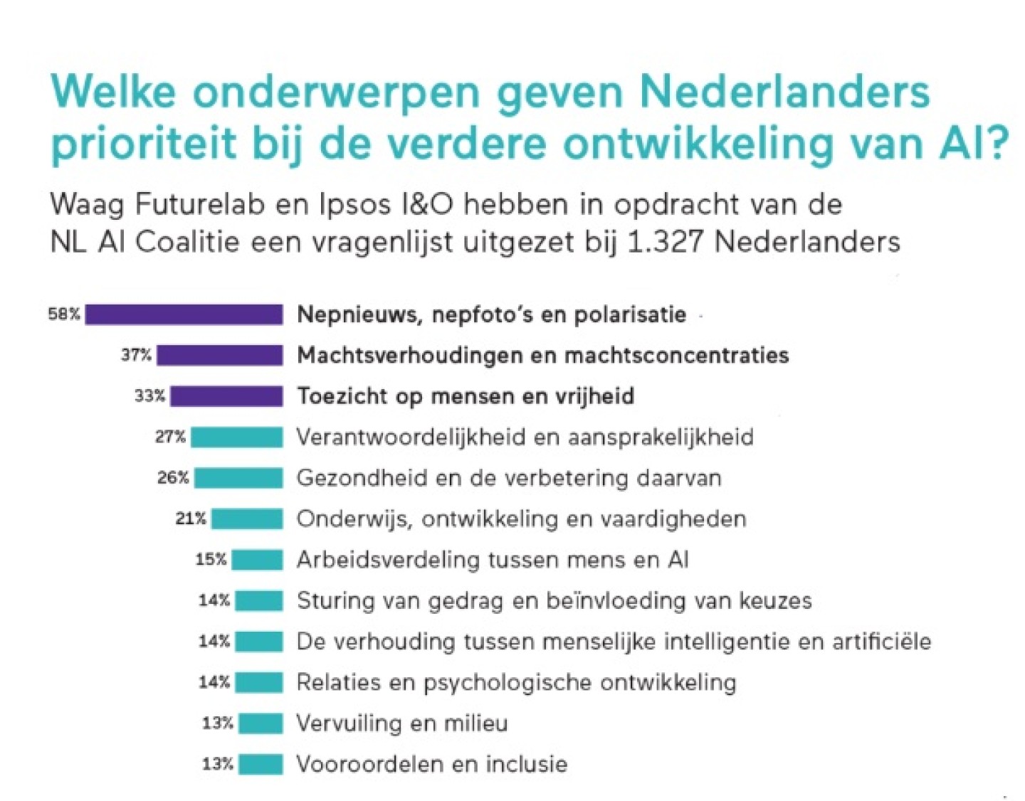 Uit onderzoek in opdracht van de Nederlandse AI Coalitie (NL AIC) blijkt dat Nederlanders zich het meest zorgen maken over nepnieuws en polarisatie. Deze onderwerpen worden het vaakst gekozen uit een lijst met thema’s waar wetenschappers in de toekomst rekening mee zouden moeten houden als ze onderzoek doen naar AI. Het onderzoek werd uitgevoerd door Waag Futurelab in samenwerking met Ipsos I&O.