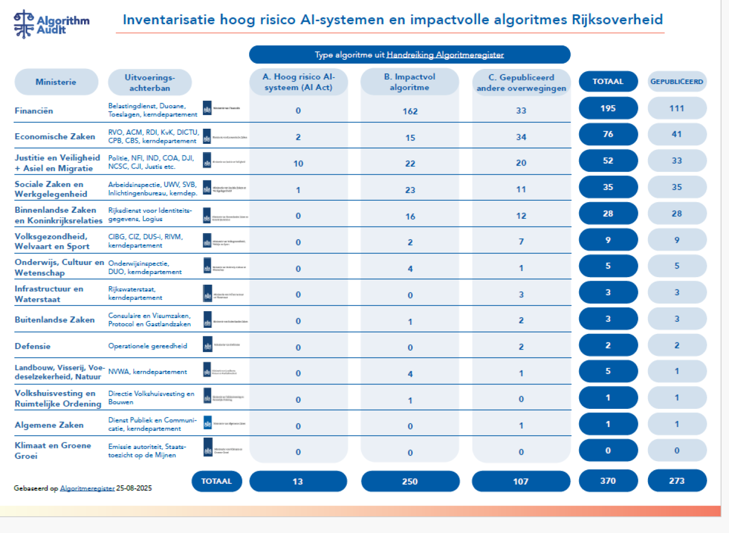 Van de 370 algoritmes die de Nederlandse rijksoverheid inzet, classificeren de departementen er slechts 13 als een hoog risico AI-systeem. Dat blijkt uit een inventarisatie van de stichting Algorithm Audit, die het gebruik van algoritmes in de Nederlandse publieke sector monitort.