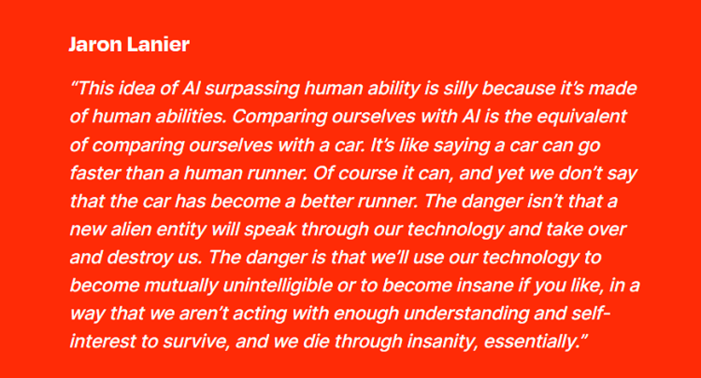 Als we ergens aan ten onder gaan, dan is dat niet aan de intelligentie van computers, maar aan onze eigen nihilistische verlangens. Of in de woorden van computerwetenschapper Jaron Lanier: aan onze eigen waanzin.