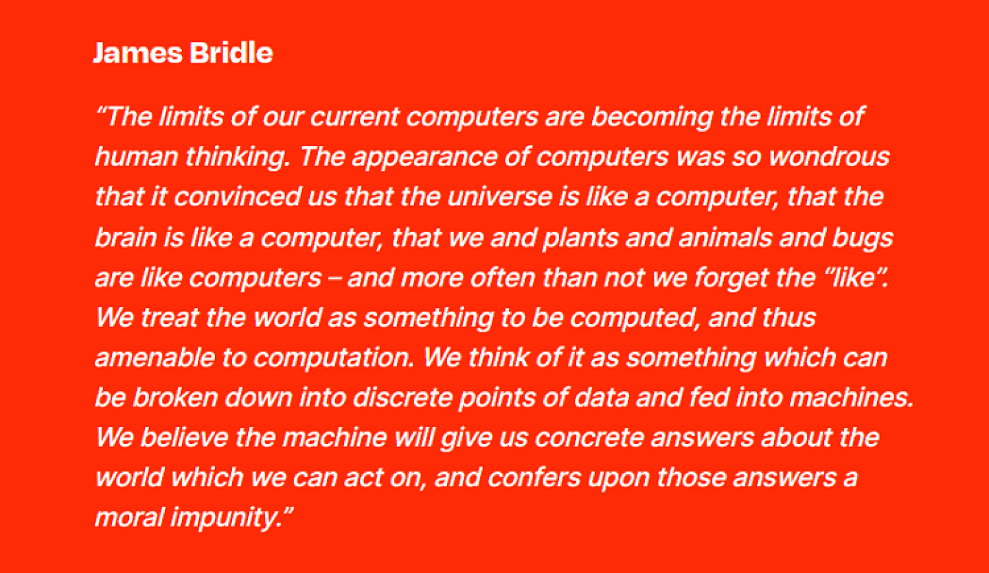 In plaats van AI-singularity, kunnen we ons dus zorgen maken over een singularity of sameness. Niet alleen 'sameness' qua content, maar ook in de manier waarop we naar de wereld kijken, waarschuwt James Bridle in zijn nieuwste boek:
