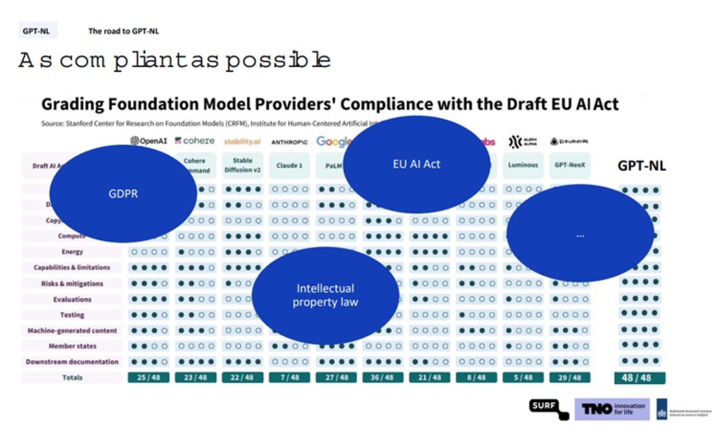 De dataset wordt vanaf de grond af opgebouwd, vertelt Lensink. "Dat doen we op zo’n manier dat we alleen data meenemen die we mogen gebruiken. Alle persoonsgegevens halen we eruit. Daarbij zin we zo transparant mogelijk over de keuzes die we daarin maken." Het model wordt gebouwd in lijn met de huidige en de aankomende wet en regelgeving, waarbij ze verwijst naar regelgeving over intellectueel eigendom, bescherming persoonsgegevens (AVG) en bijvoorbeeld de AI-Act.