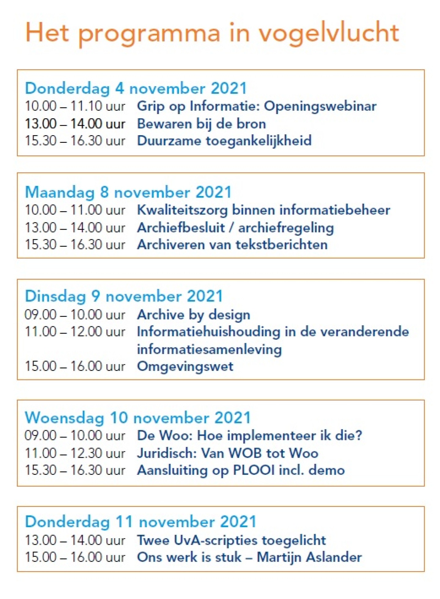 Tijdens de vierde week van Grip op Informatie wordt door middel van verschillende webinars aandacht gevraagd voor de thema’s die gekoppeld zijn aan de Wet open overheid en de Archiefwet. In deze week hebben we ook een drietal themadagen: