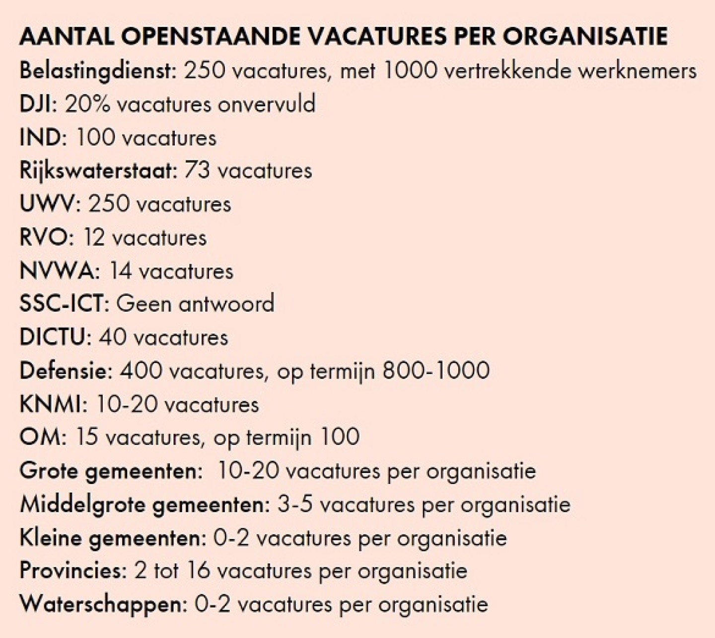 Uit het onderzoek komt naar voren dat de rijksoverheid IT’ers tekortkomt in vrijwel alle IT-gerelateerde functies. Wat opvalt is dat vrijwel alle deelnemers security-professionals noemen als niet vervulde vacature. In sommige gevallen is er een kwart minder IT’ers aan het werk dan benodigd. Diverse overheden en uitvoerders verwachten bovendien dat het tekort de komende jaren fors zal oplopen. Het ministerie van Defensie komt nu zo’n vierhonderd IT’ers tekort en verwacht dat dit aantal de komende jaren zal oplopen naar meer dan duizend. De Belastingdienst mist zo’n 250 IT’ers en moet straks ook nog eens achthonderd tot duizend vertrekkende werknemers vervangen. Het UWV is momenteel zo’n 250 IT’ers nodig. Het OM mist nu 15 IT’ers, maar ziet in de komende periode zo’n honderd IT-vacatures ontstaan en bij Dienst Justitionele Inrichtingen (DJI) is momenteel 20% van de IT-vacatures niet ingevuld.