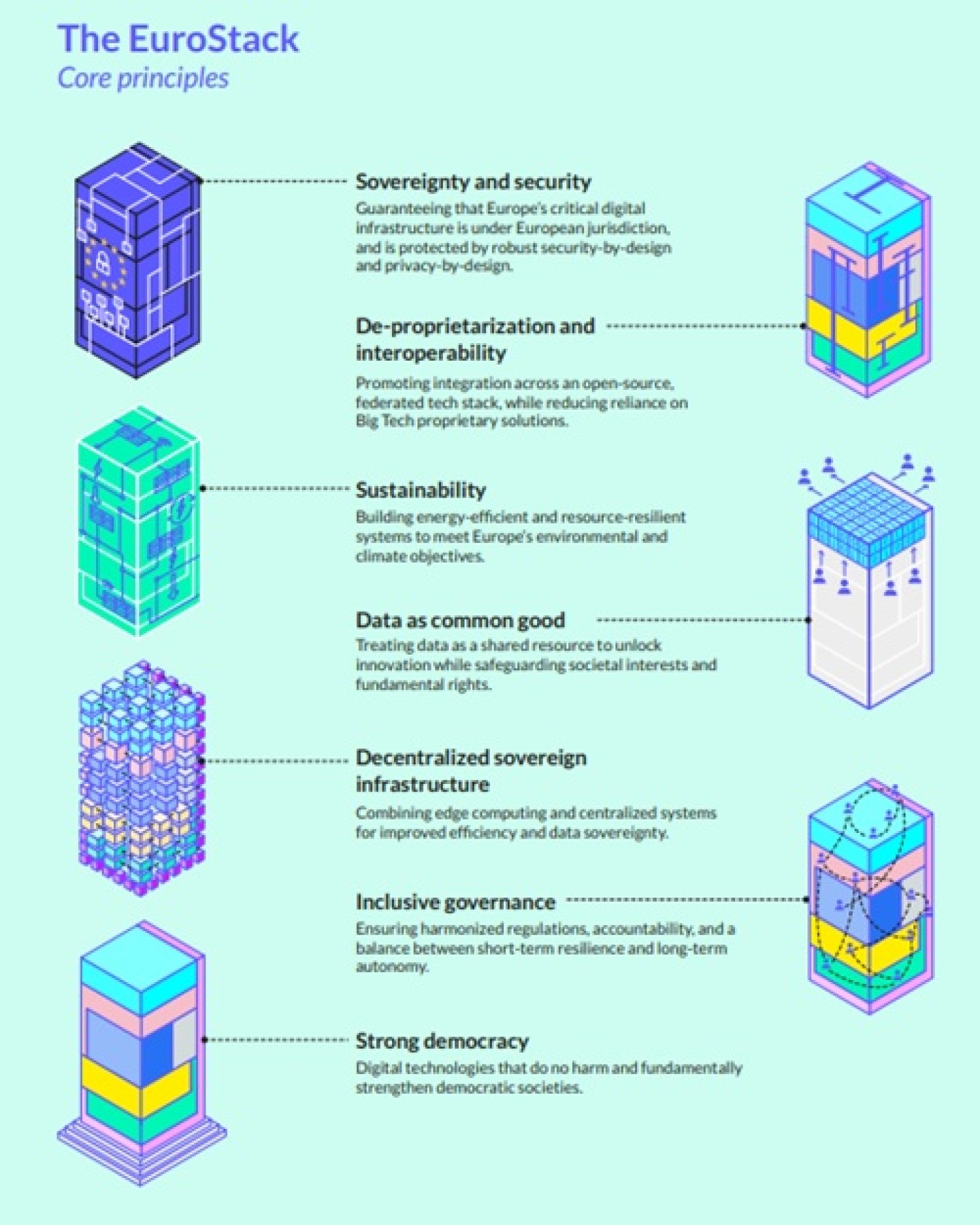 Eurostack benadrukt transparantie, verantwoording, privacy en duurzaamheid en streeft ernaar een digitaal ecosysteem te creëren dat de democratische principes en sociale rechtvaardigheid van Europa weerspiegelt. Dit gaat om de data, niet om de infra. Het gaat om het "hoe", niet om het "waarmee". Het gaat niet alleen om de tech, maar vooral om het waarborgen dat vooruitgang ten goede komt aan de samenleving als geheel. Daarom ook omvat Eurostack de héle stack, de hele stapel: een veerkrachtig digitaal ecosysteem dat ‘by design’ geavanceerde technologieën zoals AI, quantumcomputing en cloudinfrastructuur integreert. Uiteindelijk ook doosjes die dingen doen met data. Hoewel volledige zelfvoorziening onrealistisch is (onze eigen nationale trots ASML bestaat bij de gratie van wereldwijde netwerken), pleit EuroStack voor het versterken van strategische capaciteiten en het cultiveren van internationale partnerschappen.