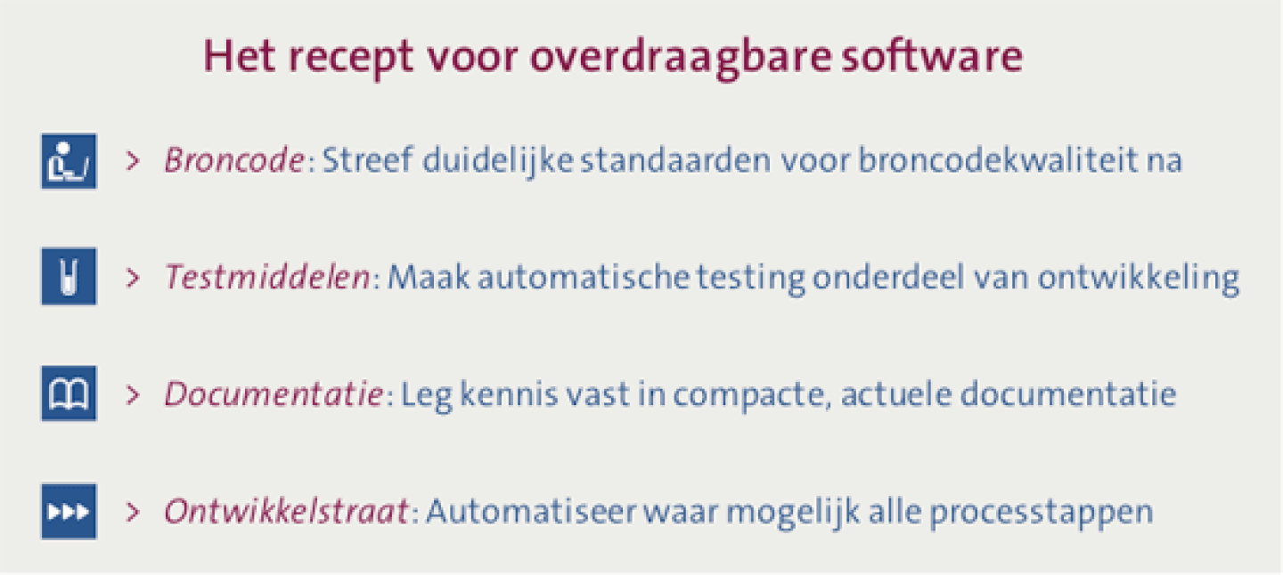 Veel van deze problemen kun je echter voor zijn: overdrachten hoeven je niet te overkomen. Overdraagbaarheid van software is namelijk te objectiveren en stuurbaar. Met vol-doende kennis over de situatie kunnen de risico’s van een overdracht goed en tijdig worden ondervangen. Om zo’n aanpak in de praktijk te brengen heeft NEN de handen ineengeslagen met een aantal marktpartijen, wat heeft geresulteerd in een ontwerp van de Nederlandse Praktijkrichtlijn (NPR) 5325: ‘Overdragen van software’. In deze richtlijn worden een aantal softwareaspecten en aanpalende zaken onderkend die van belang zijn voor goed overdraagbare software. Het onderstaande recept geeft de strekking weer.