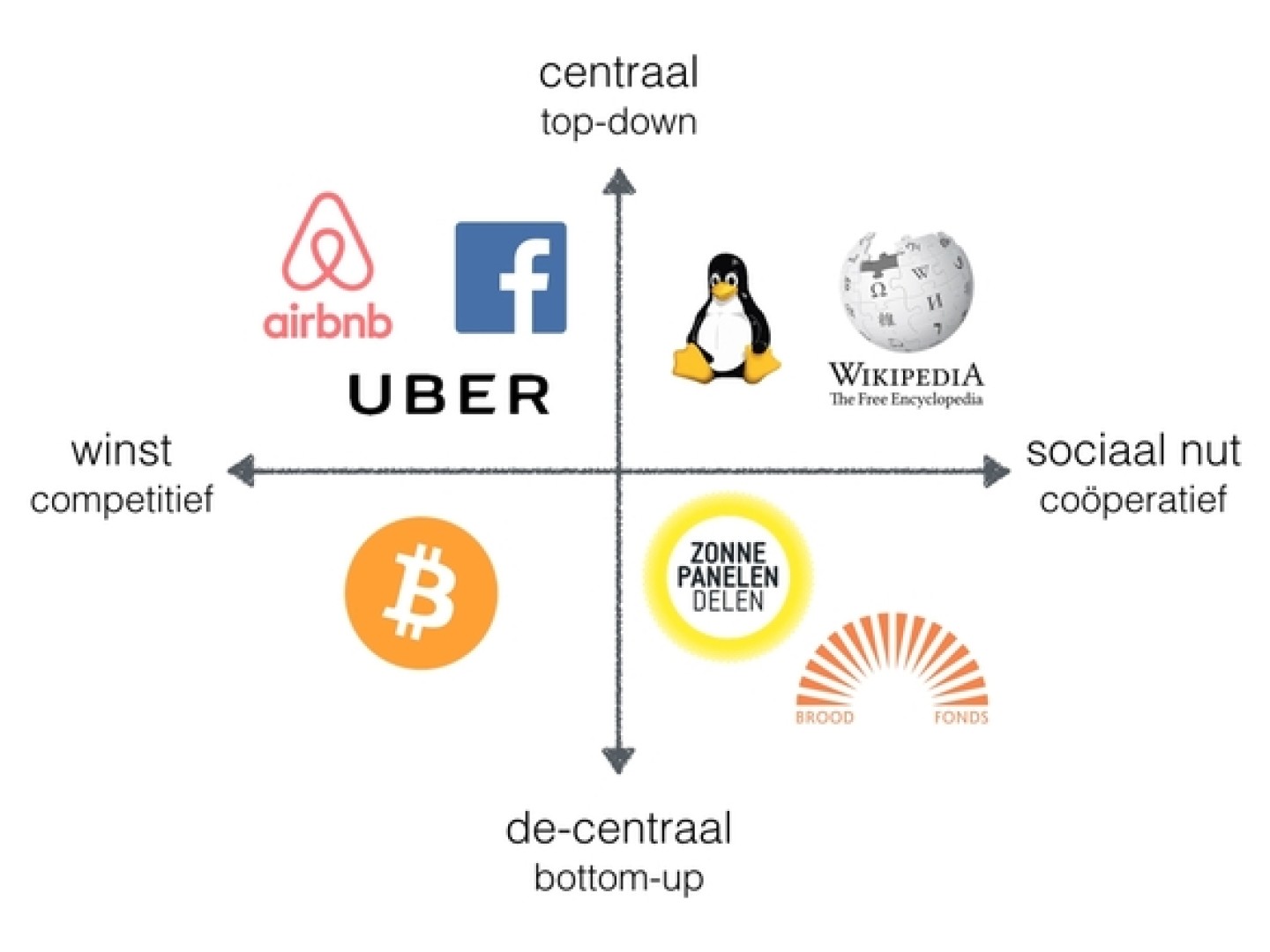 Tegelijkertijd brengt de platformsamenleving ook allerlei maatschappelijke vragen met zich mee. Hoe kunnen lokale gemeenschappen en landen profiteren van de internationale ontwikkelingen van de platformeconomie? Hoe kunnen ondernemers en burgers eerlijke toegang hebben tot platforms met bescherming van privacy en hun sociale zekerheid? Deze vragen hangen nauw samen met het ontwerp van het platform en de governance structuur: de voorwaarden waaronder spelers gebruik kunnen maken van het platform, hoe vraag en aanbod worden gerangschikt en gematcht. Platformen zijn immers niet neutraal maar per definitie geprogrammeerd en ontworpen. Ze kunnen bijvoorbeeld ingedeeld worden naar hoe open of gesloten ze zijn en of de spelers samenwerken in concurrentie of vanuit gezamenlijk, coöperatief belang (zie: onderstaand plaatje).