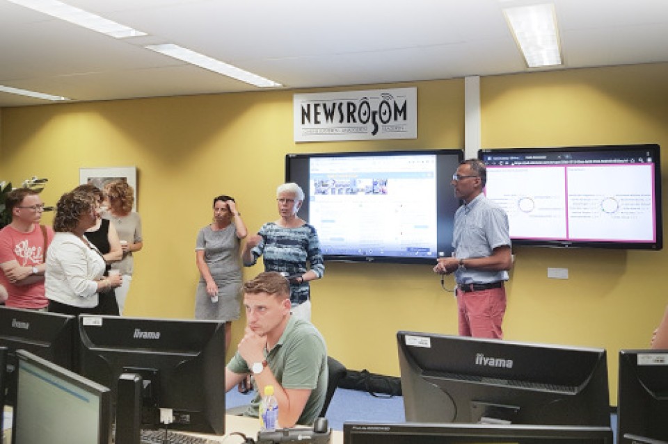 De newsroom van de gemeente Groningen met narrowcast van online realtime informatie van social media tot nieuwssites en fora. De narrowcast wordt in Groningen gebruikt bij de dagelijkse monitoring.