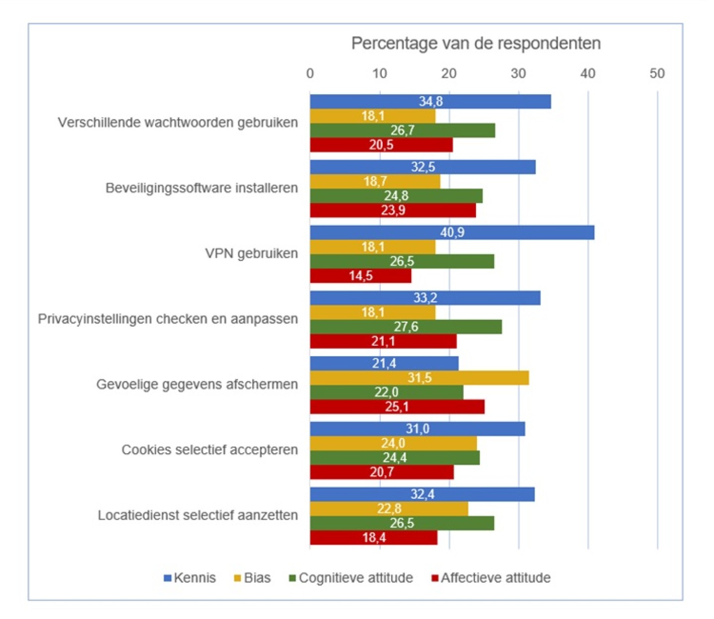 Het hierboven beschreven model bevat nogal wat factoren die het informatieveilig gedrag kunnen beïnvloeden. De vraag is in hoeverre al deze factoren in de praktijk van belang zijn. Om deze vraag te kunnen beantwoorden, hebben we een grote groep Nederlanders (N=1000) een vragenlijst laten beantwoorden naar hun omgang met hun eigen mobiele digitale media, zoals smartphones en laptops. Daarbij hebben we ook gevraagd naar de oorzaken van het vertoonde gedrag. Een van de resultaten is weergegeven in onderstaande figuur. Hierin is te zien bij welk percentage van de respondenten respectievelijk kennis, bias, cognitieve attitude, of affectieve attitude de oorzaak was om bepaald informatieveilig gedrag niet uit te voeren.