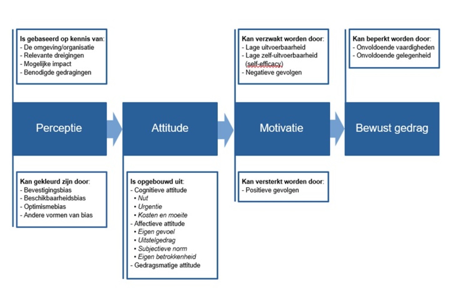 Kennis, bias en de beide vormen van attitude kunnen dus allemaal de oorzaak zijn om bepaald informatieveilig gedrag niet uit te voeren. Daarom kan het verbeteren van informatieveilig gedrag zich niet beperken tot alleen cursussen en kennistesten. Er komt meer bij kijken.
