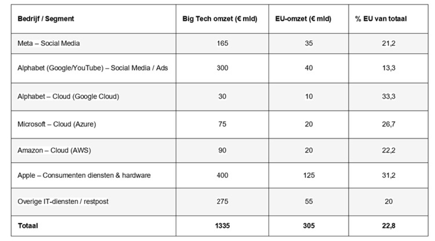 Tabel 1: de huidige Big Tech-omzet (circa € 1,3 biljoen) en het Europese aandeel daarin.