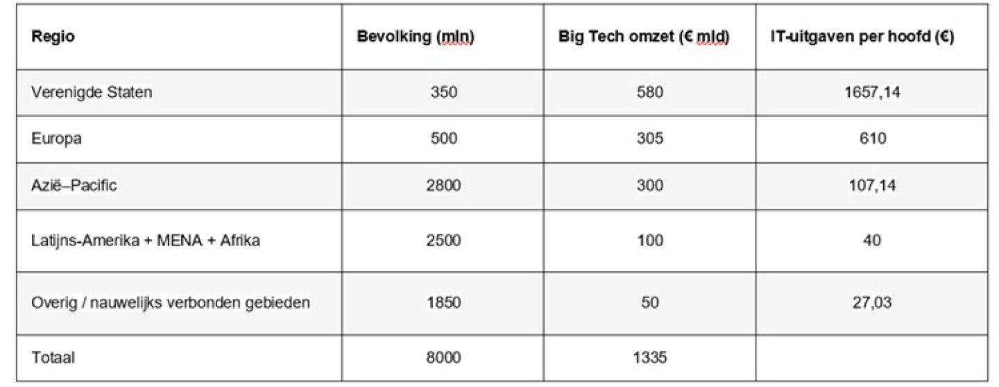 Tabel 2: Vergelijking Big Tech dienstverlenings omzet per regio en per hoofd van de bevolking per regio.