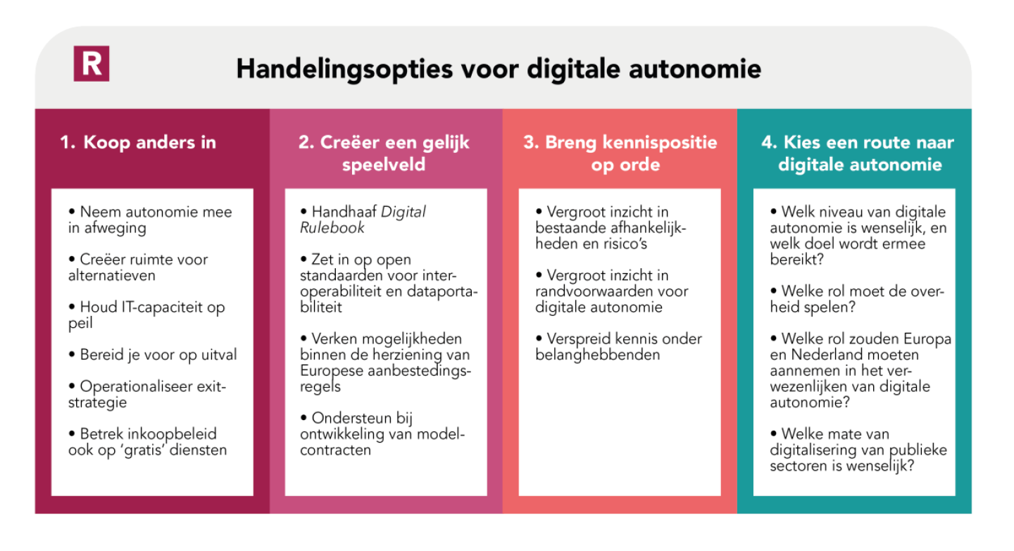 Beleidsmakers kunnen bestaande afhankelijkheden en risico’s in kaart brengen, ten behoeve van het integraal afwegingskader voor inkoop. Ze kunnen daarnaast leren van hoe de buurlanden digitale autonomie aanpakken.