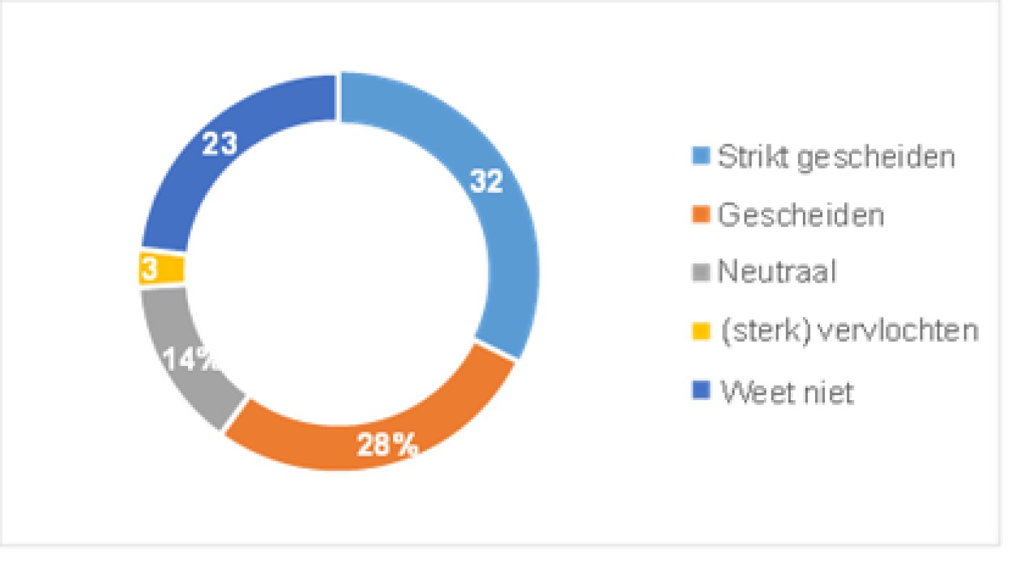 Een meerderheid van de respondenten (60%) geeft aan dat in hun gemeentelijke automatisering in de openbare ruimte niet is vervlochten met de interne IT, maar dat deze juist van elkaar gescheiden zijn (zie figuur 3). Hierbij verwijzen respondenten vaak naar segmentatiemaatregelen zoals fysieke scheiding van netwerken, compartimentering met VLAN’s, 4G routers met simkaart, of dat systemen zijn ondergebracht bij een leverancier. Verder geeft 23% van de respondenten te kennen niet goed te weten in hoeverre de gemeentelijke automatisering in de openbare ruimte is vervlochten met de interne IT.