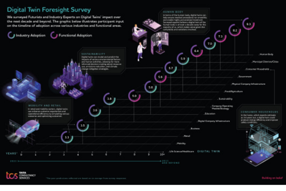 Een nieuwe studie analyseerde Tata Consultancy Services (TCS) wanneer en hoe digital twins in de toekomst verschillende sectoren zullen beïnvloeden, inclusief hun potentieel en risico's. De TCS Digital Twindex interviewde belangrijke deskundigen uit de technologiesector en ervaren futuristen, die verwachten dat digitale tweelingen een revolutie zullen veroorzaken in onze manier van leven.