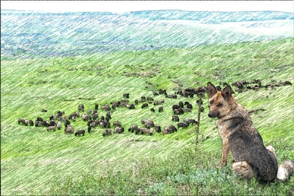 Onze hond is getraind om de kudde te beschermen tegen wolven – de gevaarlijke roofdieren die op de loer liggen, wachtend op een kans om toe te slaan.