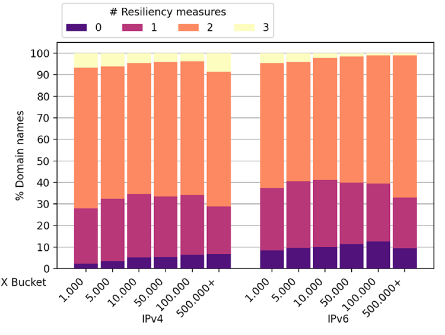 Gekeken naar de gehele .nl-zonefile, gecombineerd met de CrUX-lijst van Google, valt op dat voor de populaire .nl-domeinnamen meer maatregelen worden genomen om de weerbaarheid te verhogen. Voor meer dan 70 procent van de 1.000 meest populaire domeinnamen zijn bijvoorbeeld twee of meer maatregelen getroffen, maar dit aandeel wordt minder naarmate de populariteit afneemt.