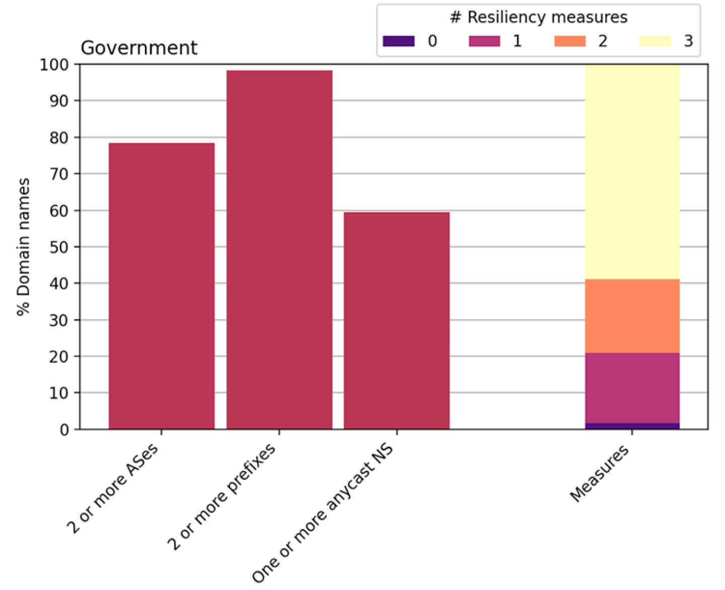 We kunnen dus concluderen dat de Nederlandse (Rijks)overheid het bovengemiddeld goed doet, als het gaat om de weerbaarheid van de DNS-infrastructuur van haar domeinnamen. Bij het gebruik van anycast is nog wel wat ruimte voor verbetering, hetzelfde geldt (in mindere mate) voor het plaatsen van DNS-servers in verschillende netwerken.