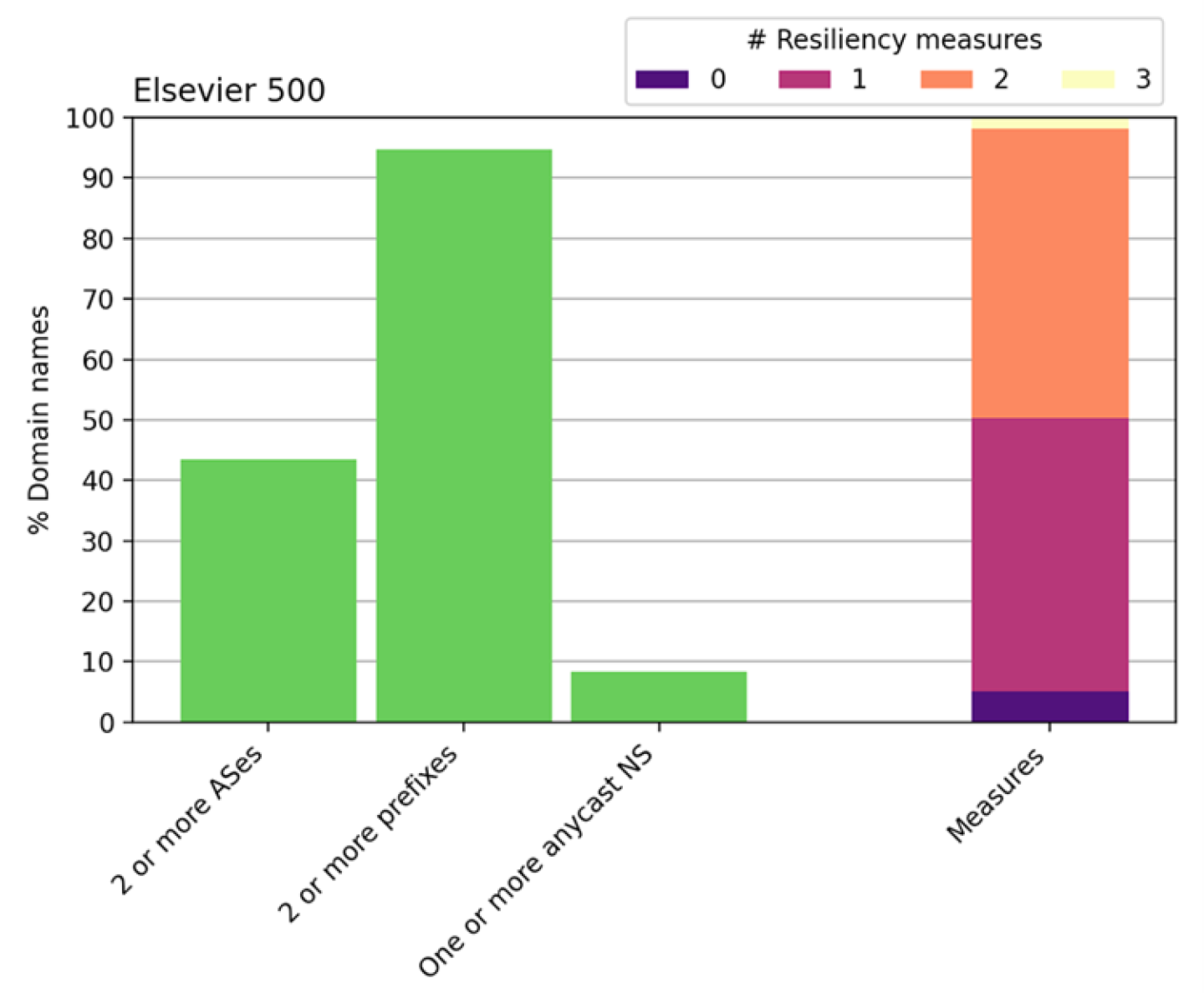 Het gebruik van anycast is iets wat we dan weer veel minder zien bij de maatregelen die de 500 grootste Nederlandse bedrijven nemen. Minder dan 10% zet deze maatregel in. Het valt bij deze groep op dat bij minder dan 50% van de domeinnamen meer dan één maatregel is genomen – significant minder dan voor de meest populaire domeinnamen op de CrUX-lijst. Een verklaring zou kunnen zijn dat populaire domeinnamen op de CrUX-lijst vaak verwijzen naar online diensten, bijvoorbeeld een webshop. Voor dit soort diensten is het mogelijk meer van belang om 100% online te zijn dan voor bijvoorbeeld een tuinbouwer op de Elsevier Top 500, waarvan de website ‘slechts’ een visitekaartje is.