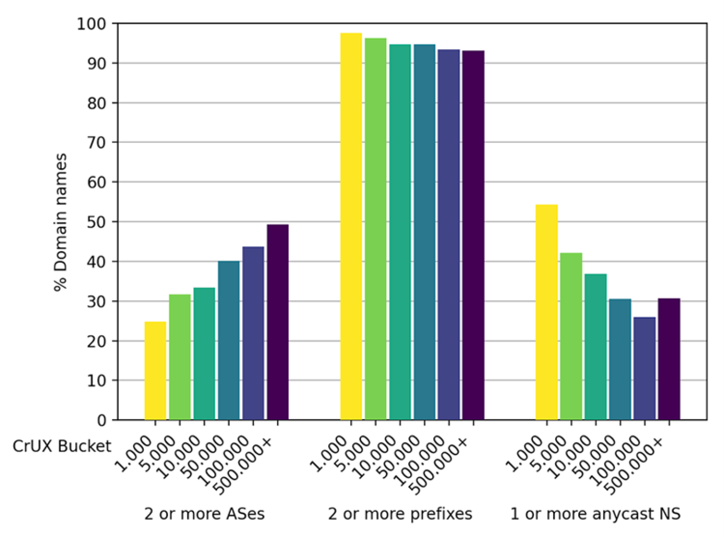 Zoomen we in op welke maatregelen genomen worden, dan zien we dat bij populaire domeinnamen minder vaak meerdere DNS-dienstverleners worden gebruikt (maatregel A). Voor minder dan 30% van de 1.000 meest populaire domeinnamen wordt gebruikgemaakt van deze maatregel. Aan de andere kant maken deze dienstverleners relatief vaak gebruik van anycast (maatregel C) om de weerbaarheid van hun DNS-servers te verhogen.