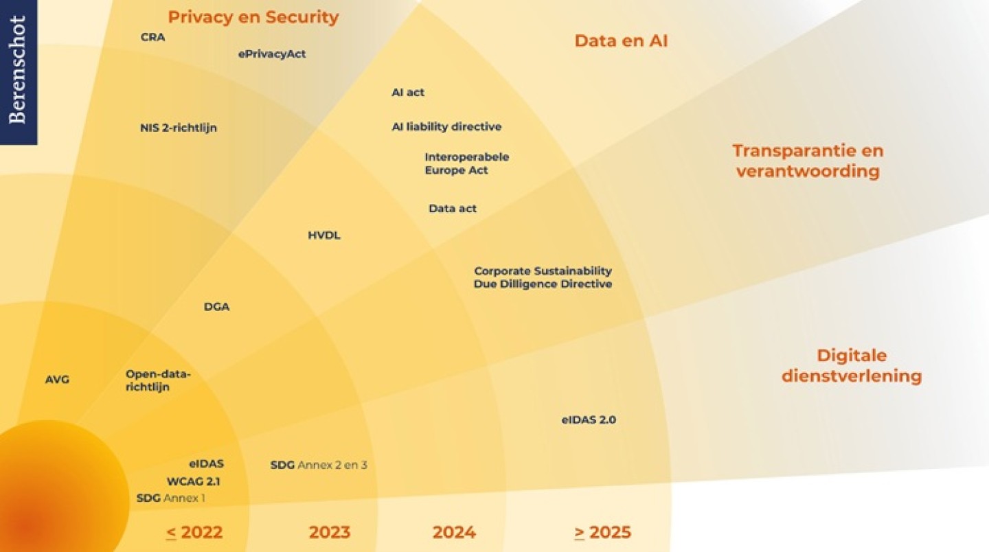 Spreker Harro Spanninga van adviesbureau Berenschot vroeg het publiek of zij door alle digitale wetgevingsbomen het bos nog zagen. De helft zei van wel en Spanninga was daarvan onder de indruk. Hij liet vervolgens het Berenschot-beeld zien van de digital decade: een opkomende zon. De wetten vallen daar in vier categorieën: privacy & security, data & AI, transparantie & verantwoording, digitale dienstverlening. Het advies van Berenschot is niet te lang te wachten met de voorbereiding op de digitale decade, die al een aantal jaren gaande is. “Ga nu al vast aan de slag met wat toch moet gebeuren, zoals een publicatieplatform voor de Woo. Wacht niet tot je alles in samenhang kunt beschouwen.”