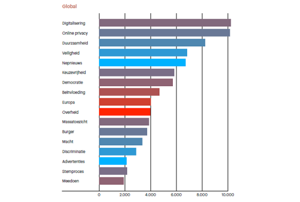 Interessant is dat veel gebruikers eerder behoefte hebben aan inzicht en transparantie, in plaats van meer inspraak. Zoals het stimuleren van digitaal burgerschap in het onderwijs, meer transparantie bij politieke advertenties en meer mediawijsheid ten aanzien van desinformatie. Met name leeftijd blijkt een belangrijke rol te spelen. Uit verdiepende analyses volgt dat jongeren (tot en met 35 jaar) in verhouding meer inzicht en transparantie belangrijker vinden. Ouderen (vanaf 36 jaar) zijn juist vaker gericht op meer burgerinspraak. Het feit dat bij jongeren democratie laag scoort als belangrijk thema (plek 10) versterkt dit. Bij ouderen staat dit thema veel hoger, in de leeftijd vanaf 68 jaar zelfs op plek 1. Het omgekeerde zie je bij nepnieuws. Bij jongeren scoort dit thema relatief hoog (plek 4) en bij ouderen opvallend laag (plek 9).