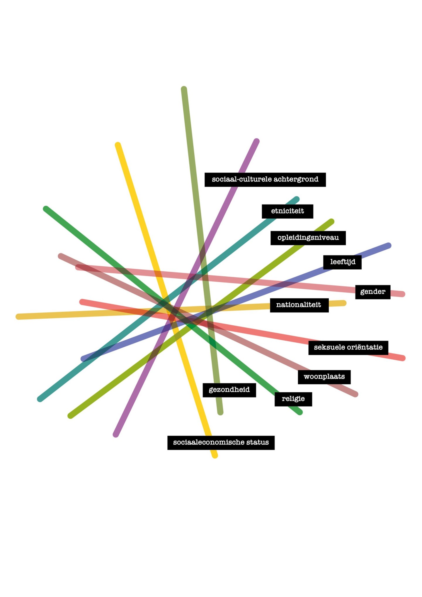 Diversiteit omvat alle manieren waarop mensen van elkaar kunnen verschillen: denk aan leeftijd, gender, religie, opleiding of culturele achtergrond. Het begrip ‘intersectionaliteit’ laat zien dat diversiteit verder gaat dan de man-vrouwverhouding in een groep, of verschillen in leeftijd: volgens intersectioneel denken doet maatschappelijke ongelijkheid zich voor langs verschillende assen van identiteit, die met elkaar overlappen of elkaar kruisen. De interactie tussen deze ‘stukjes’ van je identiteit kan verklaren hoeveel of juist hoe weinig maatschappelijk onrecht jij tegenkomt in het dagelijks leven. Diversiteit is hiermee geen simpele optelsom van deze stukjes: het gaat om de interactie tussen en combinatie van alle verschillende aspecten van je eigen identiteit en die van de anderen.