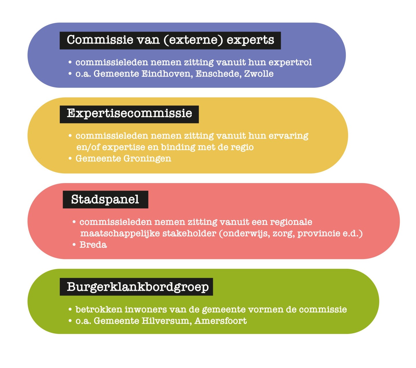 Ethische commissies zijn er in verschillende vormen en samenstellingen. De ‘klassieke’ invulling is er een van experts, waarbij leden worden gekozen op basis van (vaak academische) expertise over bijvoorbeeld juridische zaken, ethiek en (techniek)filosofie of technische kennis. Daarnaast bestaan er burgerpanels, waarin commissieleden zitting nemen vanuit een bepaalde ervaring en/of expertise en binding met de regio. In stadspanels worden bepaalde maatschappelijke regionale stakeholders vertegenwoordigd, zoals de zorg of het onderwijs. Ook zijn er gemeenten, zoals Groningen, die kiezen voor een combinatie: een kern van mensen met uiteenlopende expertise en een schil van inwoners eromheen.