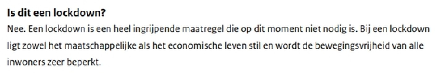 Vervolgens lees ik tussen de antwoord op de veelgestelde vragen dat de Nederlandse aanpak geen lockdown is. Het zal ongetwijfeld feitelijk juist zijn, maar zo intelligent als de lockdown cq. aanpak is, de woordkeuze erover dus niet. De is geen onhandigheid drie – dit is ondoordacht.