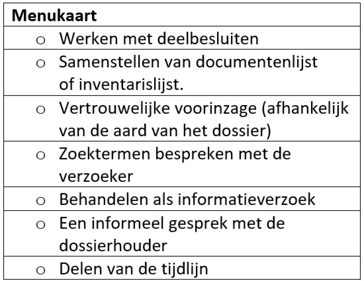 2. Zorg voor een goede voorbereiding van het gesprek. Denk aan een ‘menukaart’ voor het gesprek tussen overheid en verzoeker waarop verschillende opties staan.