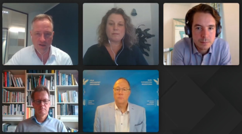 Bovenste rij, van links af: Jaring Hiemstra, Karin Akkers en Wouter Welling. Onderste rij, van links af: Paul Strijp en Frans Feldberg. Beeld: screenshot iBestuur Thuisdebat #7