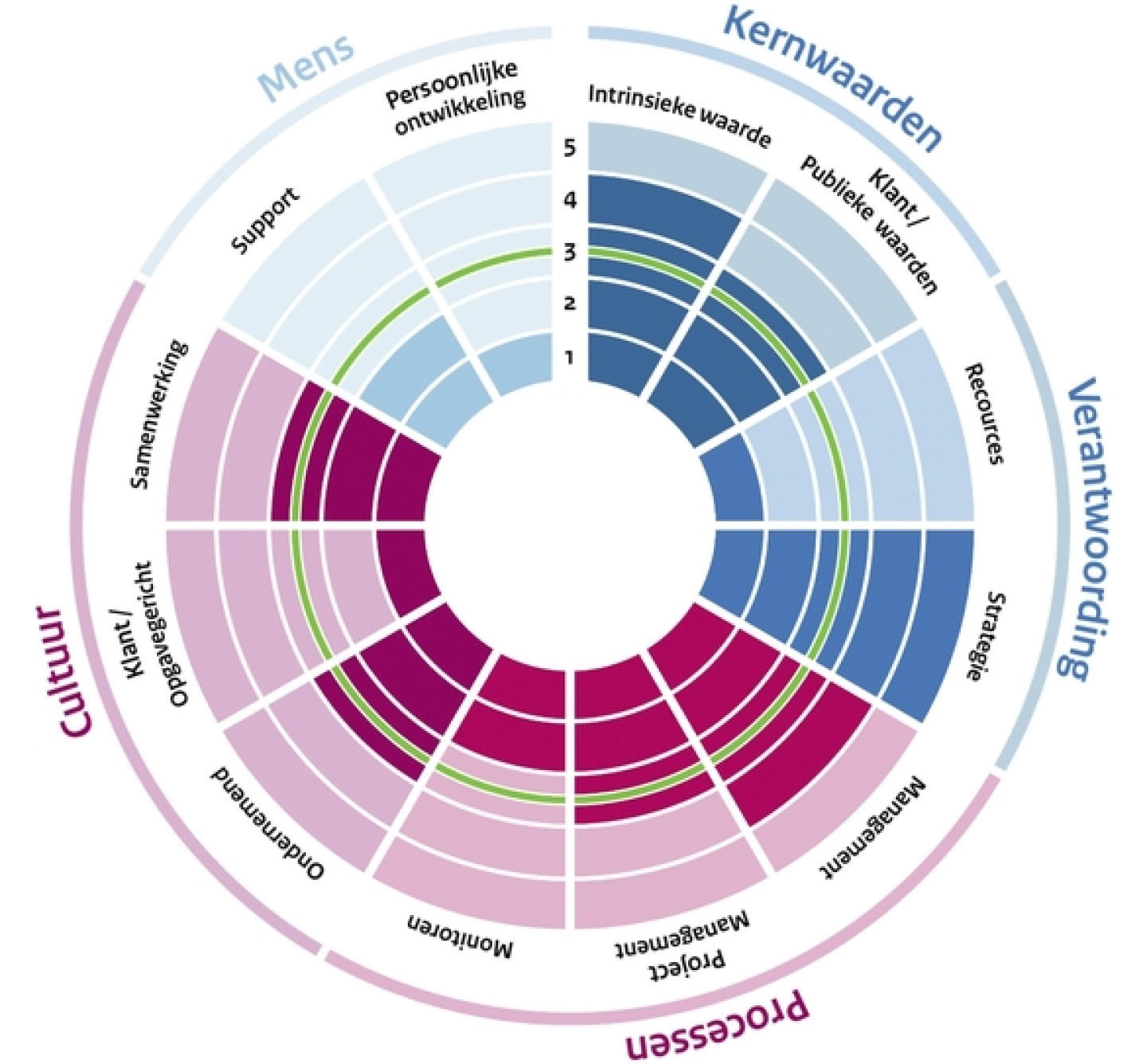 Om aan de specifieke behoefte hierin vanuit de overheid te voorzien heeft Uitvoeringsorganisatie Bedrijfsvoering Rijk (UBR) in samenwerkingen met universiteiten, bedrijven en de Total Innovation Management (TIM) Foundation een assessment instrument op twee niveaus ontwikkeld: de Innovation Maturity Self-Scan en de Innovation Maturity In-depth. De assessments geven een indicatie van de volwassenheid van de organisatie om op gestructureerde wijze innovaties te realiseren. De self-scan is medegebaseerd op de PMK Projectmanagement tool die binnen UBR door I-Interim Rijk al sinds 2015 wordt ingezet. De nadruk ligt op het adviseren bij het creëren van de benodigde uitgangspunten en randvoorwaarden voor succesvolle implementatie en excellente uitvoering. Aan de clusters uit het start-up-way model van Ries hebben we voor overheden een specifiek cluster toegevoegd: de focus op kernwaarden en rekening houden met factoren als maatschappelijke impact, ethiek, duurzaamheid en inclusie.