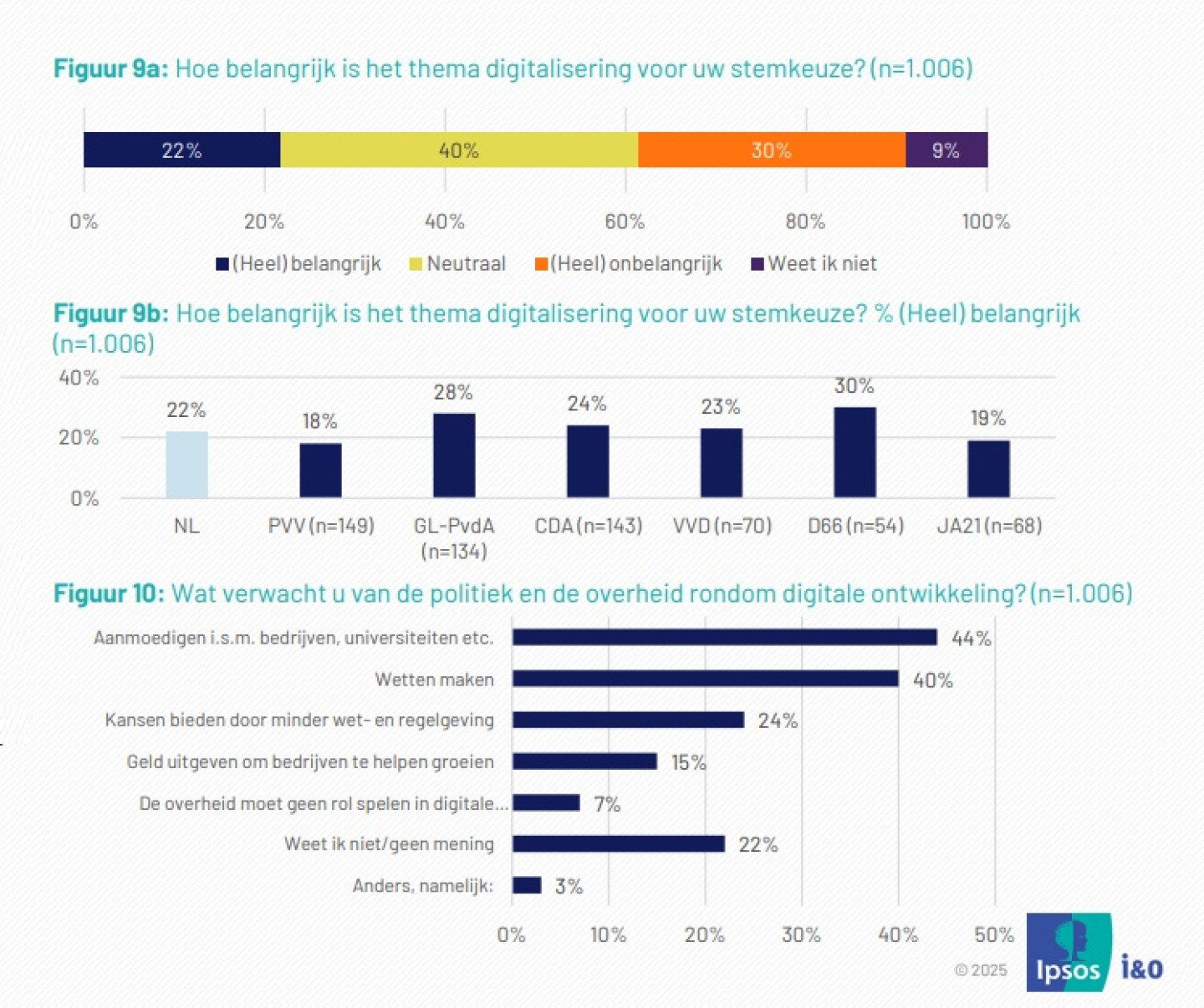 Het Ipsos I&O-onderzoek laat een dubbel beeld zien: er is breed maatschappelijk draagvlak voor een actieve, sturende overheid op digitalisering, maar het thema speelt nauwelijks een rol in de politieke keuzes van burgers. Met de verkiezingen in aantocht is niet te verwachten dat partijen dit gat gaan dichten.