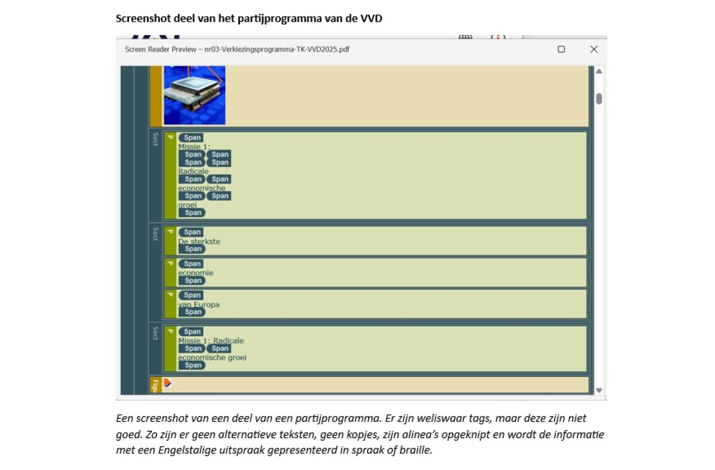 Dit betekent dat 2,8 miljoen kiesgerechtigden - mensen die blind zijn, slechtziend, dyslectisch, doof of Doof zijn, of cognitieve of motorische beperkingen hebben - de verkiezingsprogramma's niet of niet goed kunnen raadplegen. Voor deze groep zijn toegankelijke digitale documenten niet een luxe, maar een voorwaarde om gelijkwaardig te kunnen participeren in het democratisch proces. Dit raakt de kern van onze democratie. De partijprogramma's geven aan hoe partijen die straks regeren en in de Tweede Kamer zitten de toekomst van het land zien. Dit zijn belangrijke documenten in de samenleving en de politiek. Het gaat niet om het barrooster van de biljartclub.