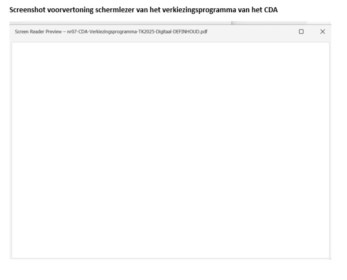 Links een screenshot van de voorvertoning schermlezer van het verkiezingsprogramma van het CDA. De inhoud die getagd is, is bedoeld om de tekst en opmaak te presenteren aan hulpapparatuur. Het vak is leeg: er is dus niets om aan te bieden.