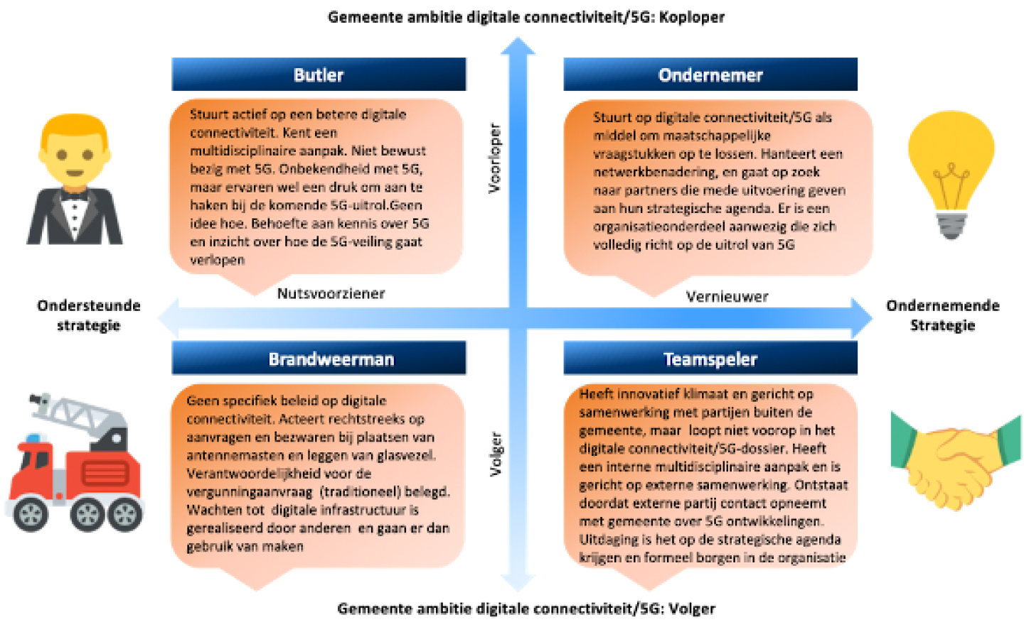 Uit de impactanalyse blijkt dat gemeenten op verschillende manieren omgaan met digitale connectiviteit, waar 5G een onderdeel van is. Waar de één terughoudend is en uitsluitend de vergunningen verleent, is de ander actief met bedrijven aan de slag om innovatie in de gemeente te stimuleren. “In deze archetypes is geen goed of fout, maar het is wel belangrijk dat je je als gemeente bewust bent welk type het beste bij je past. Dat inzicht kan je helpen bij de uitrol van 5G binnen je gemeente,” zegt Rudolf Roeleven. Hierdoor kan de wijze van uitrol van 5G verschillend zijn en passend bij de huidige situatie, ambitie en de identiteit van de gemeente.
