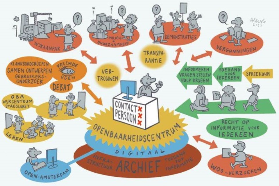 De gemeente Amsterdam werkt aan het Openbaarheidscentrum Amsterdam. Bij het Openbaarheidscentrum worden inwoners geholpen bij het zoeken, vinden en gebruiken van informatie: zowel digitaal als fysiek. Sofie Bustraan is informatiecommissaris van de gemeente Amsterdam en verantwoordelijk voor het opzetten van het Openbaarheidscentrum. "Dat doe ik samen met collega’s van het Stadsarchief Amsterdam. Jaike Rothengatter heeft een belangrijke rol als projectleider en we werken samen met de Open State Foundation."